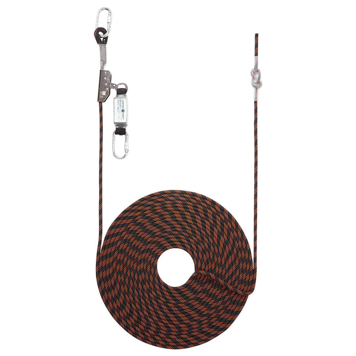 Fall arrest system with 12mm diameter kernmantle rope anchorage line with one non-openable rope grab (equipped with one alloy steel screw gate carabiner and an energy absorber) and one carabiner at the extremity of the rope.