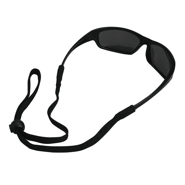 Elasticated cord which adjusts to wearer's preference. Universal holder to fit a large variety of spectacles temples.