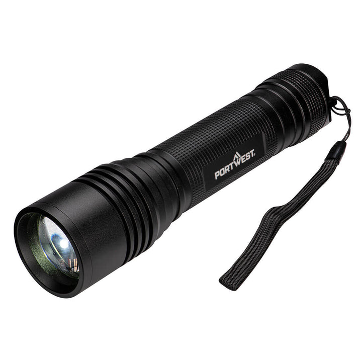 Highly efficient and multi-functional hand held torch with zoom control. The durable aluminium house provides excellent impact resistance and the textured finish ensures a reliable grip. Wrist strap included.